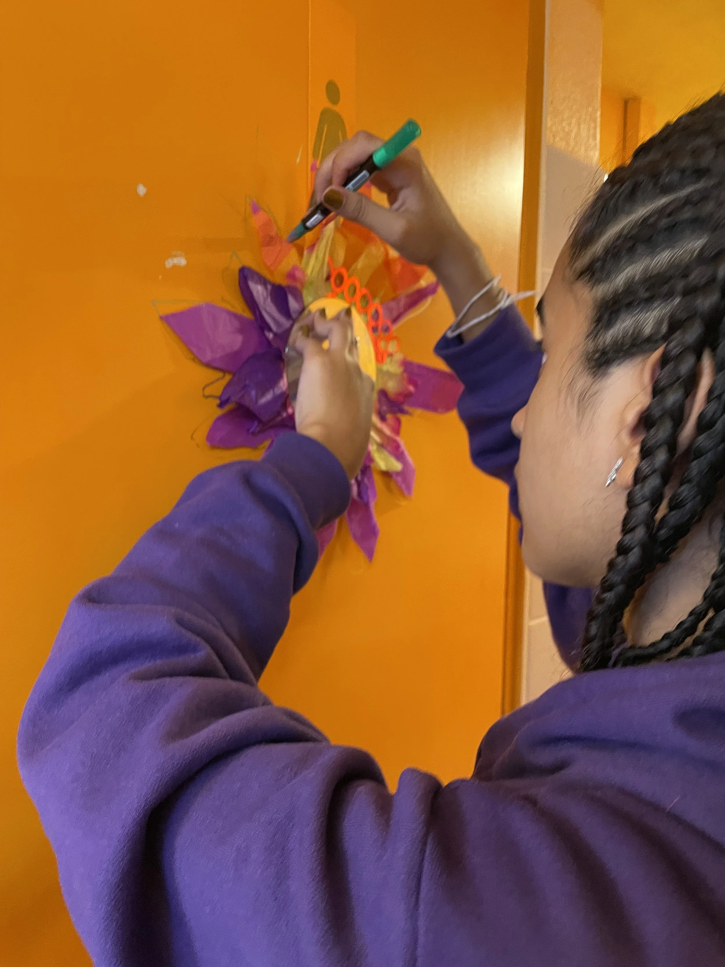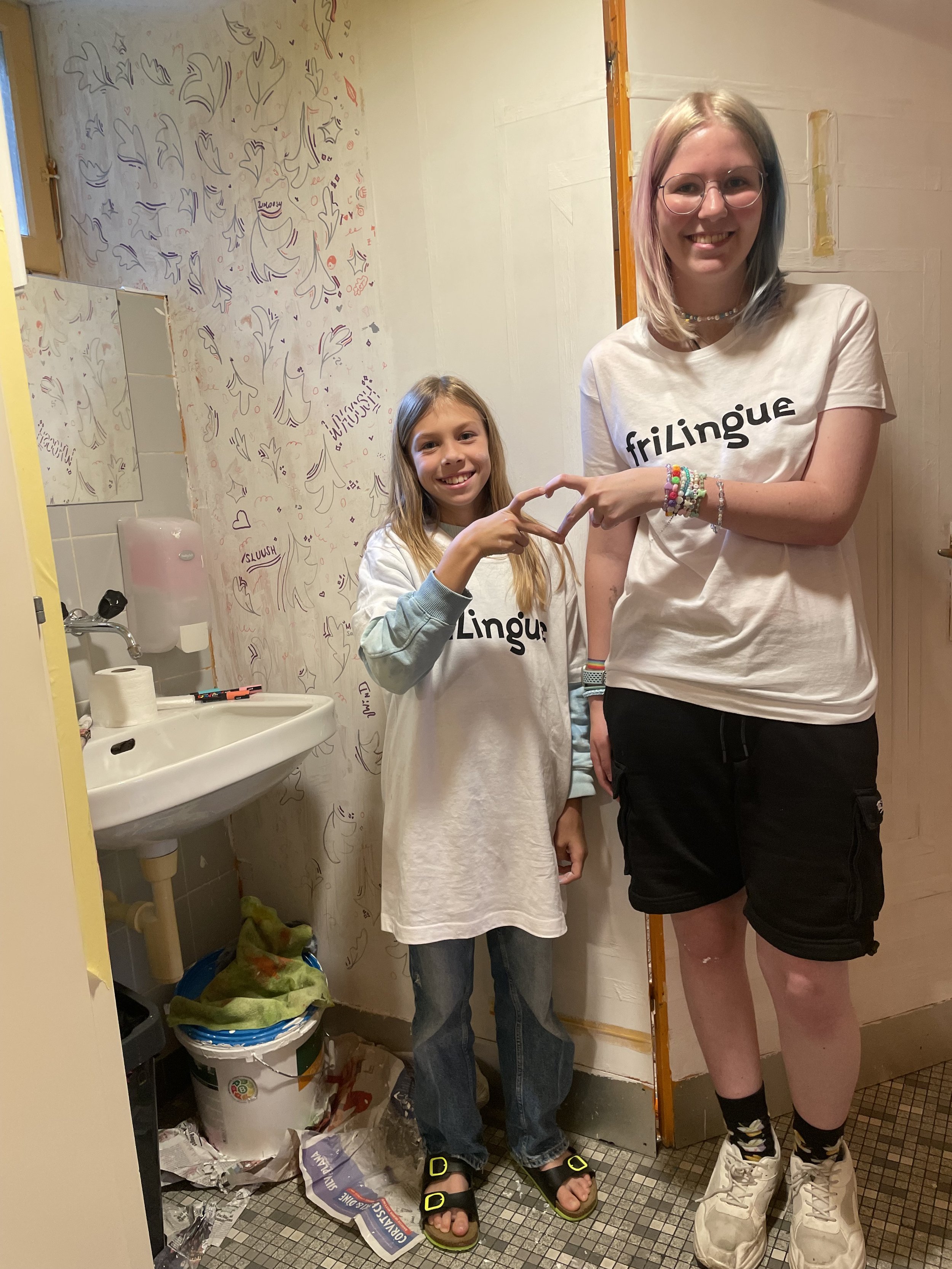 Durante mi residencia artística en el Hostel Adrenalin, tuve la oportunidad de coordinar un workshop con los niños y niñas de los Summer Camps de Frilingue, desarrollado en los baños del hostel. El objetivo de este taller era abrir un espacio de libre expresión, sin imponer estructuras rígidas ni guías estrictas, invitando a cada participante a intervenir el espacio a gusto y placer.